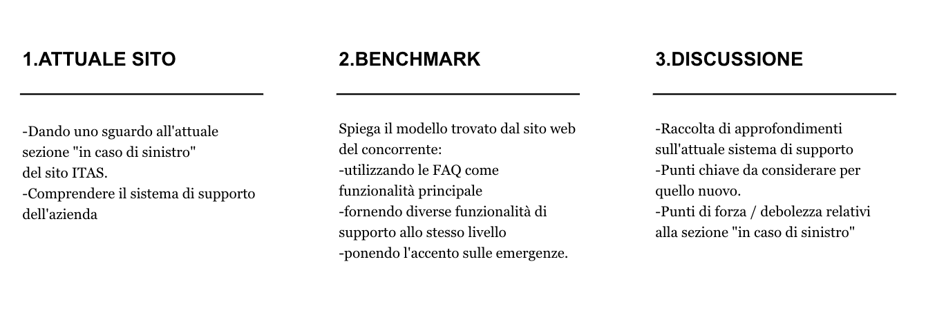 After having a clear task coming from them we needed to define our work plan, since ITAS was very open to work with us we wanted to go more in depth into the knowledge of the company and really know who they are, what were their pain points and also the strengths that define them and made them one of the best insurance company in Italy. Our steps to follow were: